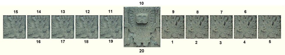 Arriba, El friso labrado en la Puerta del Sol representa los once pilares del muro calendario. Cada pilar marca la posición de la puesta del sol en un 1/20mo de la órbita de la Tierra, y un mes lunar sideral corresponde a la distancia que existe entre un pilar y medio representando 3/40mos de la órbita. Dibujo de J.M. Allen según la interpretación de Oscar Corvison del sistemal vigesimal con la iinterpretación adicional de J.M. Allen.