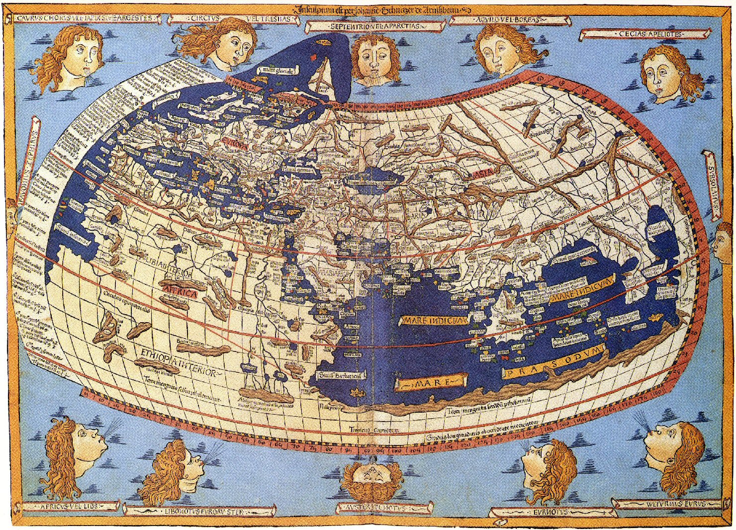 that the inhabited world stretched in latitude from Thule (Shetland) to Agisymba (Tropic of Capricorn) and in longitude from the Isles of the Blessed to Shera (China).